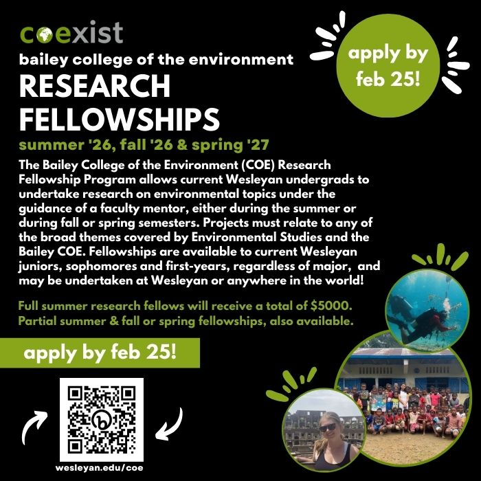 During fall 2025, students and faculty from across Wesleyan pursued a coordinated set of research and creative projects at Manresa Island in Norwalk, Connecticut. The 25-acre island within a tidal marsh system of the Long Island Sound served as a Jesuit retreat in the late 19th and early 20th centuries before being acquired by Connecticut Light and Power for the construction of a coal-fired power plant. Over its 50 years of operation, the plant transitioned from coal to oil and expanded the land mass by roughly 100 acres, largely through the disposal of coal ash and dredge spoils. Since the plant’s decommissioning and abandonment in 2013, the island has developed an urban ecology marked by remnant industrial structures, an early-successional birch forest rooted in ash deposits, and resident populations of turkey, deer, and osprey along its rocky shoreline.
