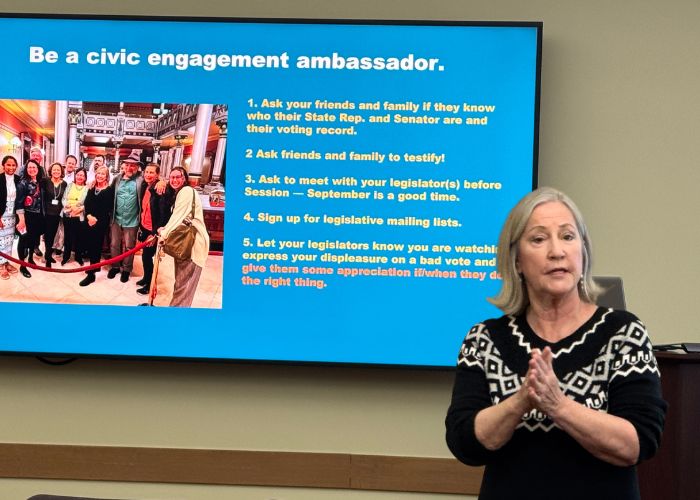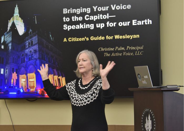 On Wednesday, February 18, Wes students, faculty, and staff joined former state rep Christine Palm, founding director, The Active Voice, for From Campus to the Capitol: Your Step-by-Step Guide to Transforming Wesleyan Student Voices into Connecticut Environmental Policy Change. The event was sponsored by the Bailey College of the Environment.
